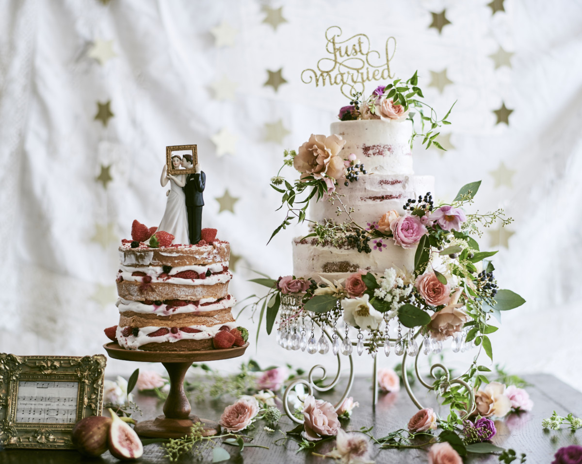 スポンジケーキの焼き色を活かしたデザインのネイキッドケーキや、生花でデコレーションした華やかな3段ケーキ*.⁺。*゜₊